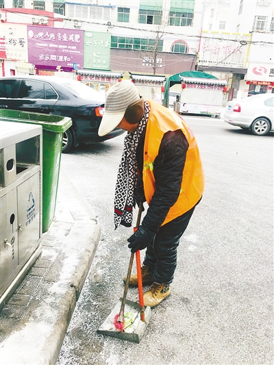 2月10日上午,室外氣溫很低,天空飄著雪花,記者在市區(qū)黃河西路見到了正在保潔路面的環(huán)衛(wèi)工人肖中周。皮手套、耳暖、圍巾、帽子,雖然他全副武裝,可仍抵不住這冬日的嚴寒,臉頰被凍得通紅。他告訴記者,凌晨4點他就起床到達了自己負責的路段,開始打掃路面。過年期間,為了保證路面的干凈整潔,他和負責該路段的另一名環(huán)衛(wèi)工輪流值班。