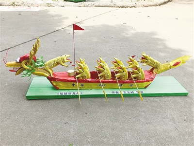 “先用鐵絲編織出模型,然后再把彩帶依著鐵絲的模型纏在外面,彩帶要錯落有致,能體現(xiàn)出龍頭及金豬身上的紋路,光龍頭就編了四個多小時。”王云峰說,龍舟雖然看著簡單,可制作起來并不容易。為了能盡快完工,他每天晚上都忙到12點多。