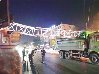 不一會(huì)兒,救援人員趕到現(xiàn)場(chǎng),在限高桿附近擺放警示標(biāo)志,提醒過(guò)往車輛和行人小心。隨后,救援人員找來(lái)一輛挖掘機(jī),把鏟斗升起,托著搖搖欲墜的限高桿,防止其墜落。然后,救援人員對(duì)限高桿進(jìn)行修復(fù)。
