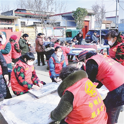 當(dāng)天一大早,45名巾幗志愿者帶著灶具、面粉、鮮肉、蔬菜等物品來到了陳東村村民廣場上。她們和面、剁餃子餡忙得熱火朝天。沒多久,一碗碗熱氣騰騰的餃子便出鍋了。隨后,志愿者們把餃子分發(fā)給到場的老人和孩子,還發(fā)放了年歷、對聯(lián)、紙抽等禮品,并為放學(xué)歸來的兒童送上一個個精美的書包。
