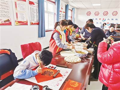 活動(dòng)開始前,社區(qū)共建單位漯河市實(shí)驗(yàn)中學(xué)的老師和學(xué)生們進(jìn)行了寫春聯(lián)、送春聯(lián)活動(dòng),社區(qū)志愿者則在一旁包餃子。