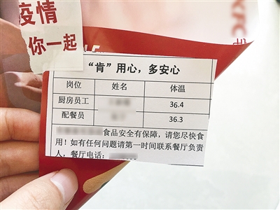 記者注意到,在打包袋的外側附有一張小紙條,紙條上標注廚房員工和配餐員的姓名以及當日的體溫等信息,紙條下方還留有餐廳的聯(lián)系電話,保證生產(chǎn)、配送等各環(huán)節(jié)均可追溯,保障食品安全,讓市民用餐更放心。