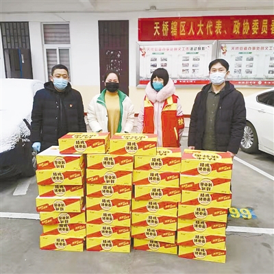 2月6日,志愿者楊英偉(左二)自費(fèi)購買100箱方便面,分別送給召陵區(qū)東城街道辦事處、天橋街道辦事處和召陵區(qū)政協(xié)防疫值班點(diǎn)。記者 朱 紅 攝