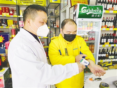 王黎明所在的社區(qū)有5平方公里,居民將近1萬(wàn)人,最近復(fù)工復(fù)業(yè)的店鋪有百十家, 他每天都要把這些店鋪?zhàn)邆€(gè)遍,就像醫(yī)院里的醫(yī)生“查房”一樣,給店鋪的員工測(cè)量體溫,了解他們的身體健康狀況,然后做好登記。同時(shí),他還要指導(dǎo)店鋪開(kāi)展好環(huán)境消毒,給員工們講解防疫知識(shí)以及如何正確佩戴口罩。