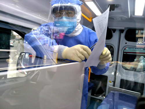 下午接到新的任務(wù),其中需要轉(zhuǎn)運一位女性患者。剛剛開車,她的電話就響了起來。董晶兵護士就提醒她,因為車上還有其他患者,在車上請保持安靜,最好不要打電話。她看了看手機,說家里有一個一歲半的兒子剛斷奶一星期多都沒見了,是家里打的電話,說著說著就哭了起來。同車的患者了解她的情況后表示理解,一致同意讓她接了電話。董晶兵看了看她的轉(zhuǎn)診信息,年齡才33歲,比自己大一歲。聽著她和家人交談的話語,董晶兵也想起了自己的孩子。兒子比她孩子小兩個月,昨晚視頻還叫爸爸了。看著眼前的場景,董晶兵一下子實在沒忍住,淚水瞬間流了下來。