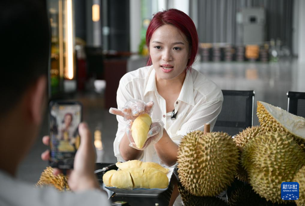 7月20日,在海南省三亞市優(yōu)旗大嘴鳥(niǎo)榴蓮園一號(hào)基地,網(wǎng)絡(luò)主播在視頻直播中介紹國(guó)產(chǎn)榴蓮。