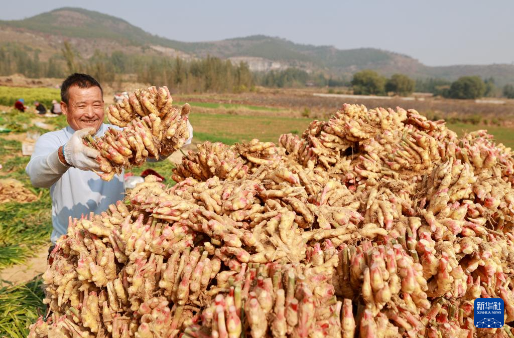 10月30日,山東省棗莊市市中區(qū)稅郭鎮(zhèn)農(nóng)民在生姜種植基地收獲生姜。