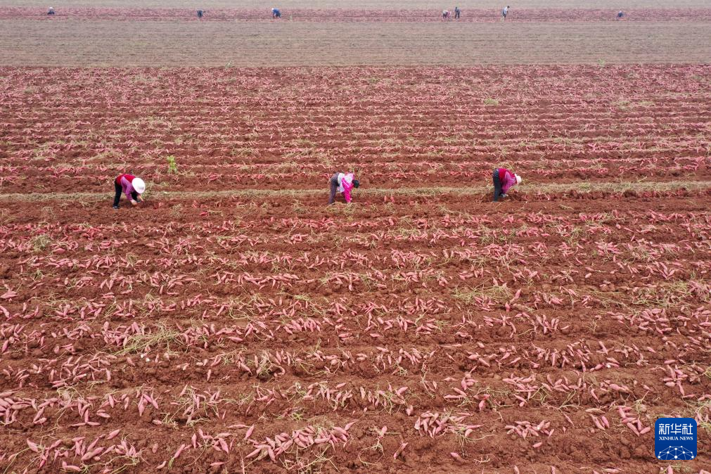 10月30日,在河南省沁陽(yáng)市王曲鄉(xiāng)東王曲村一家庭農(nóng)場(chǎng),農(nóng)民在田間收獲紅薯(無人機(jī)照片)。