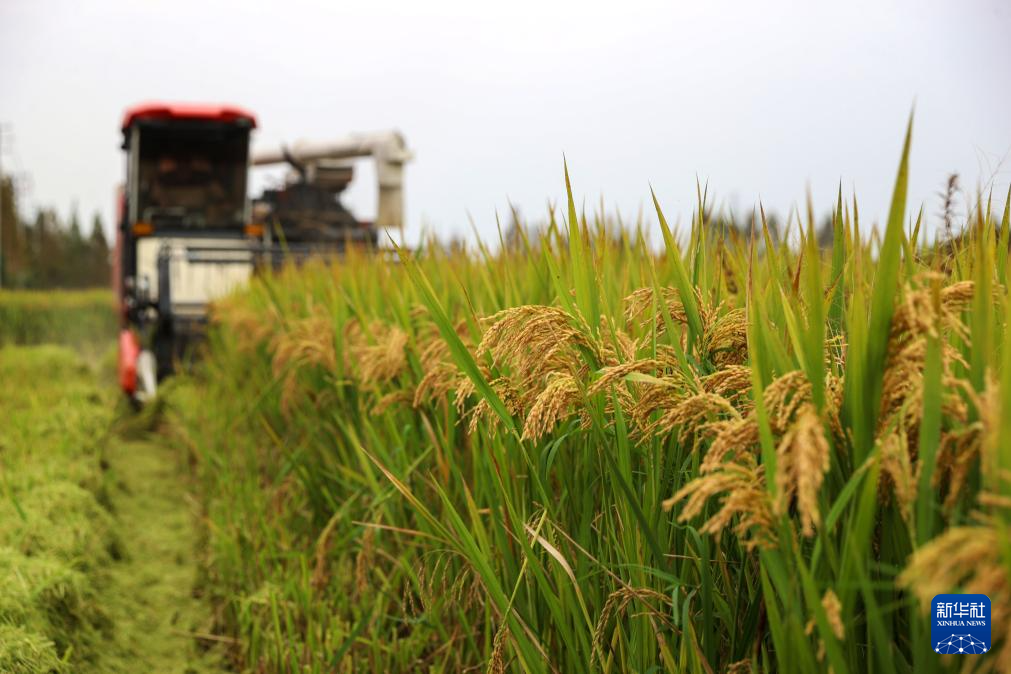 10月30日,浙江省湖州市吳興區(qū)埭溪鎮(zhèn)官澤村村民駕駛收割機(jī)收割水稻。