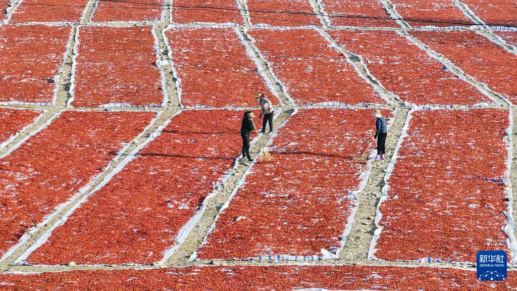 10月30日,農(nóng)民在河北省遵化市一家專業(yè)合作社的曬場(chǎng)晾曬山楂干(無人機(jī)照片)。