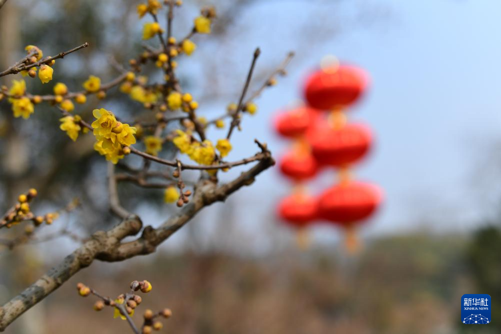 1月5日,在江蘇無(wú)錫梅園,綻放的臘梅與大紅燈籠相映成景。