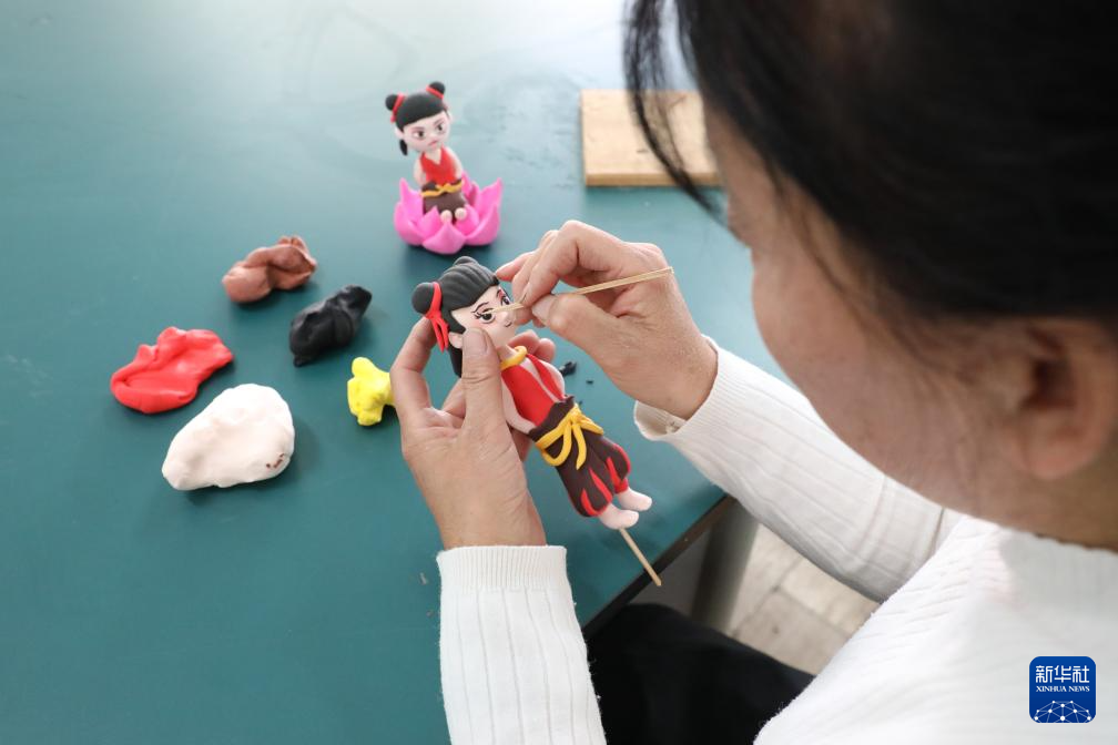 2月20日,泥塑藝人楊愛(ài)華在山東省濱州市的一所小學(xué)創(chuàng)作哪吒主題泥塑。
