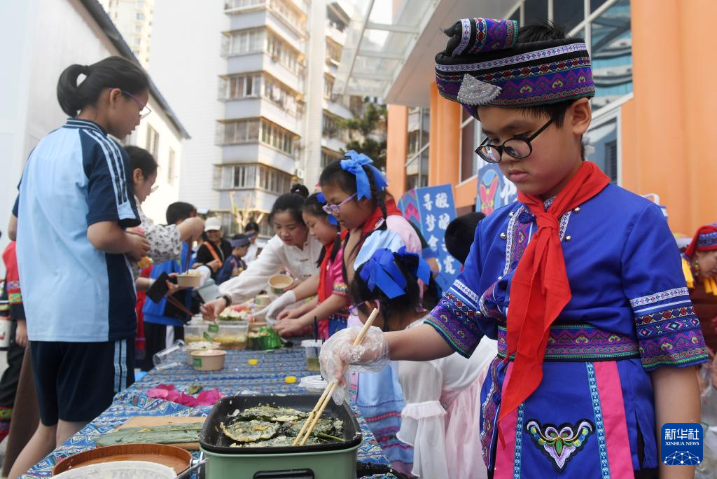 3月27日,孩子們在廣西南寧市民族大道東段小學品嘗傳統(tǒng)美食。