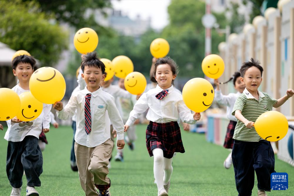 5月6日,浙江省湖州市長興縣實驗幼兒園的孩子們手舉笑臉氣球,進行“笑臉賽跑”小游戲。