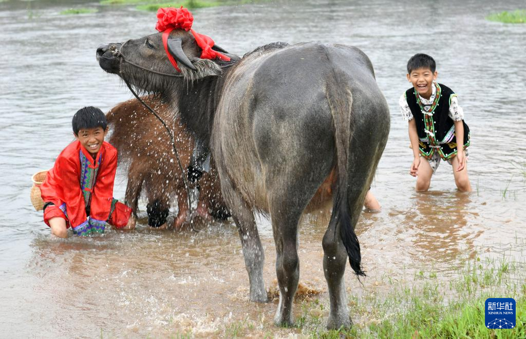 5月5日,在廣東省清遠市連山壯族瑤族自治縣上帥鎮(zhèn)東君村,身著壯族服飾的小朋友在中洲河里沐牛。