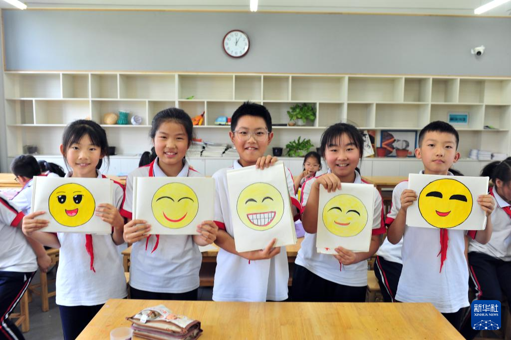 5月7日,湖北省宜昌市秭歸縣實驗小學學生在美術課堂上展示自己創(chuàng)作的笑臉卡通美術作品。