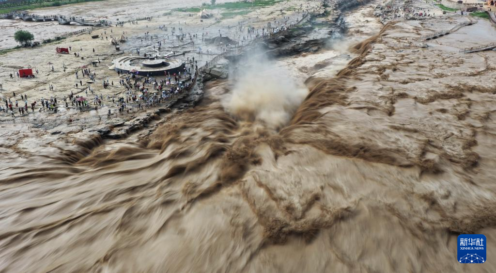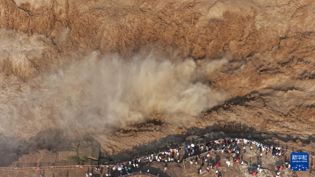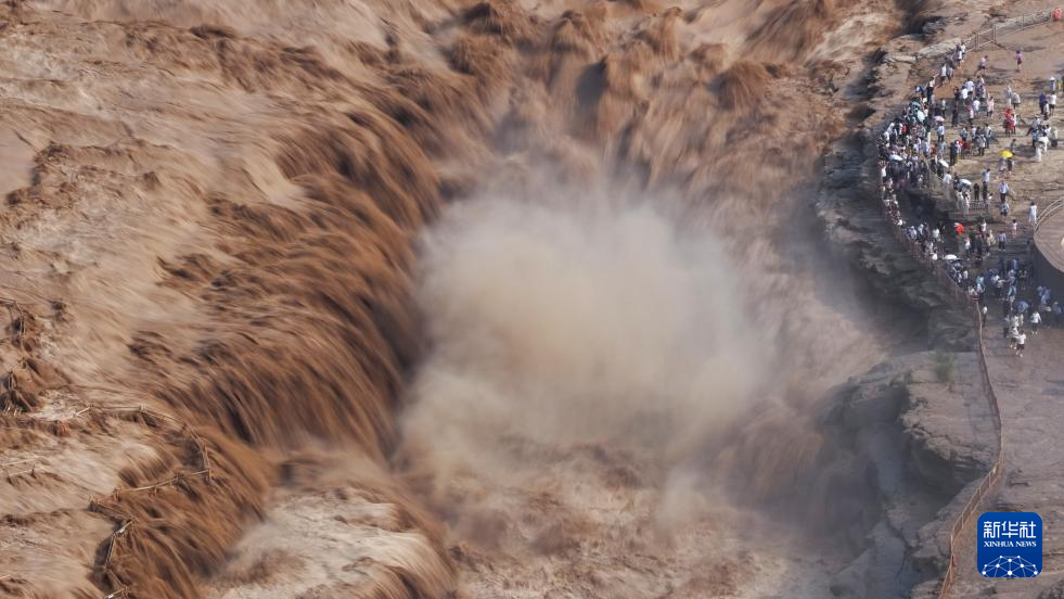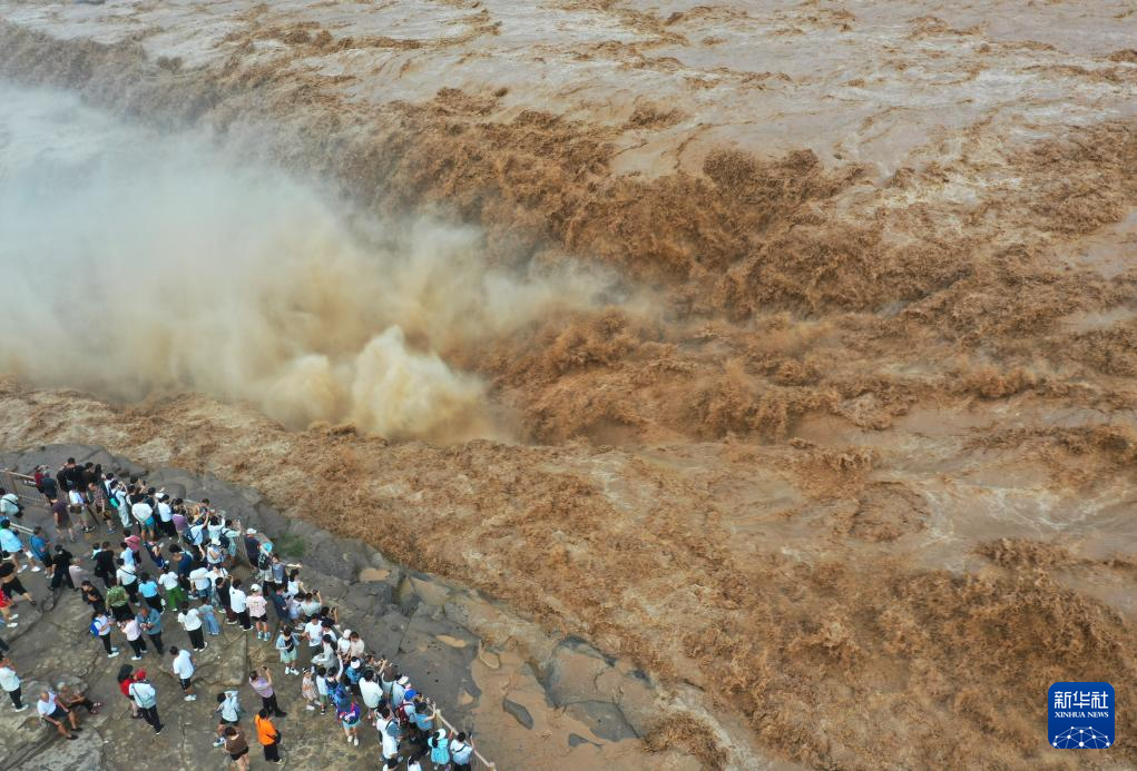 7月27日,人們?cè)谏轿骷h觀看黃河壺口瀑布(無(wú)人機(jī)照片)。
