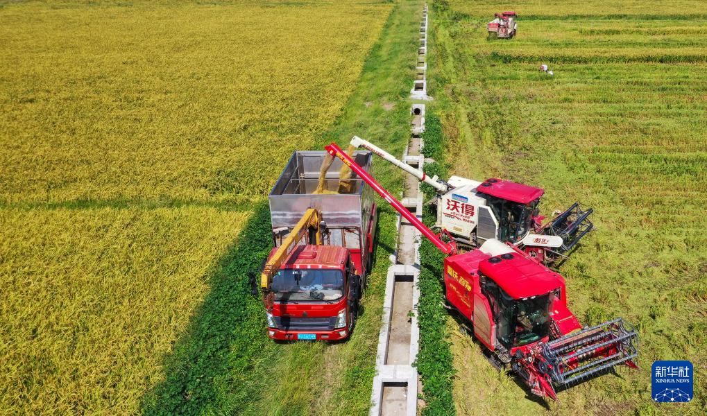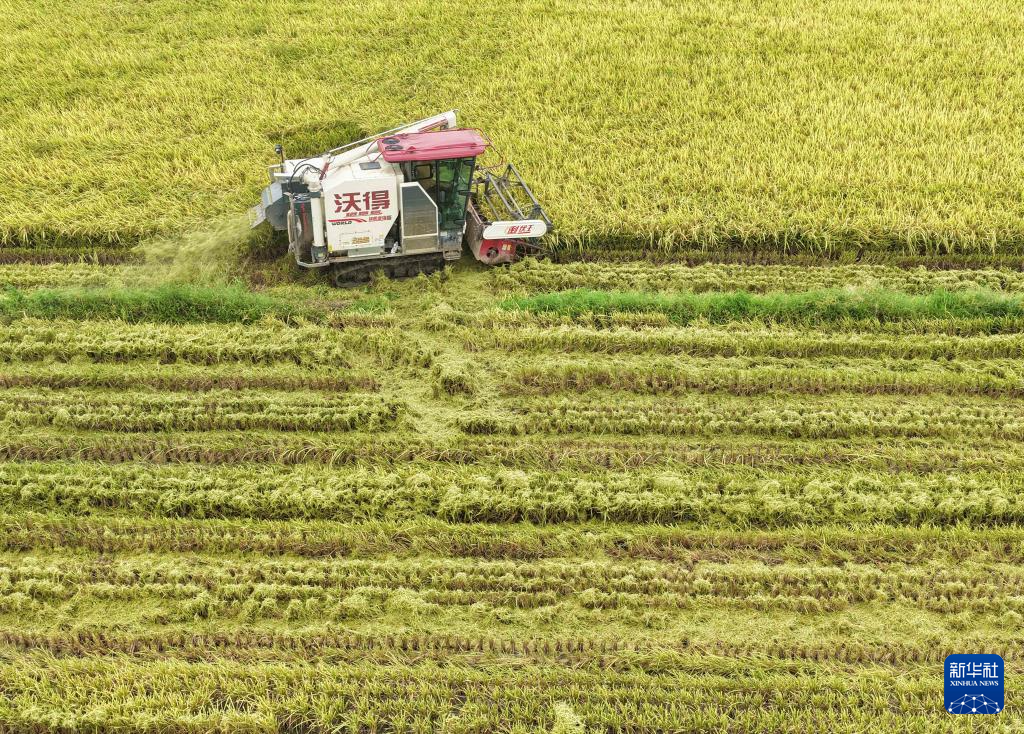8月7日,在湖南省永州市道縣壽雁鎮(zhèn)社下村,農(nóng)民駕駛農(nóng)機收割水稻(無人機照片)。