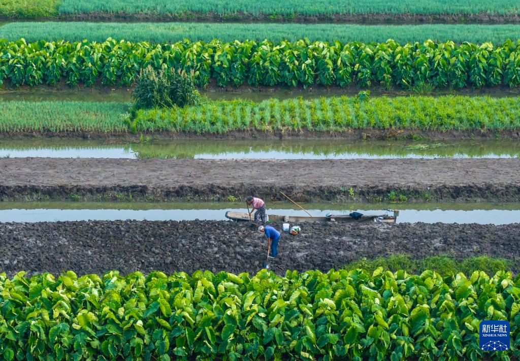 8月7日,農(nóng)民在江蘇省興化市垛田街道高家蕩村的田間勞作(無人機照片)。
