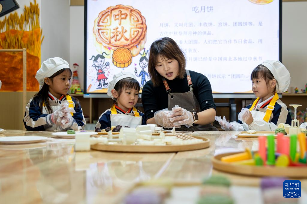 9月29日,在河南省商丘市睢縣古襄路幼兒園,小朋友們?cè)诶蠋煹闹v解下學(xué)習(xí)制作冰皮月餅,了解中秋習(xí)俗。